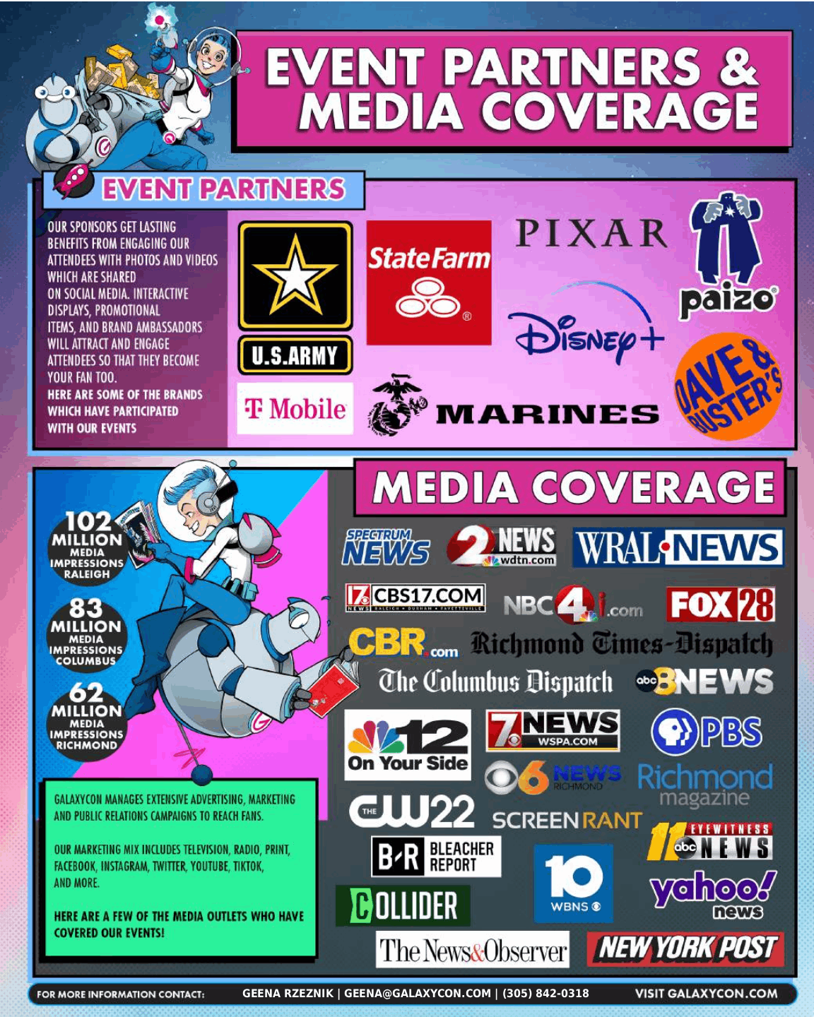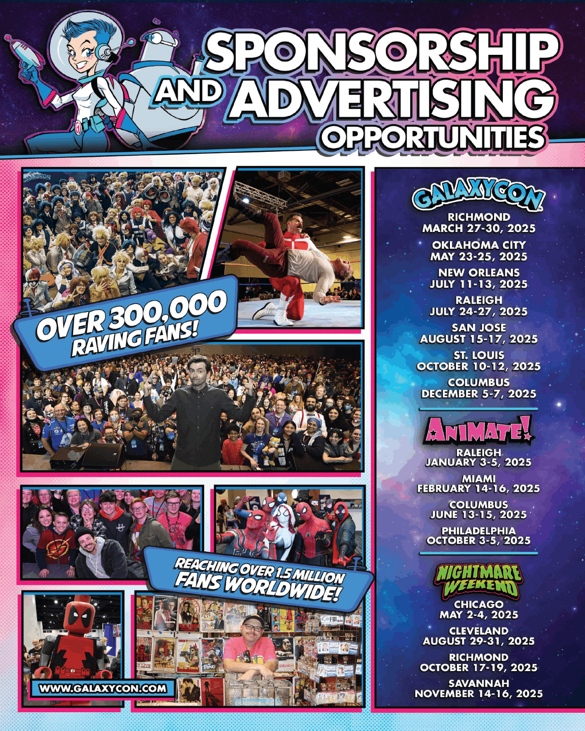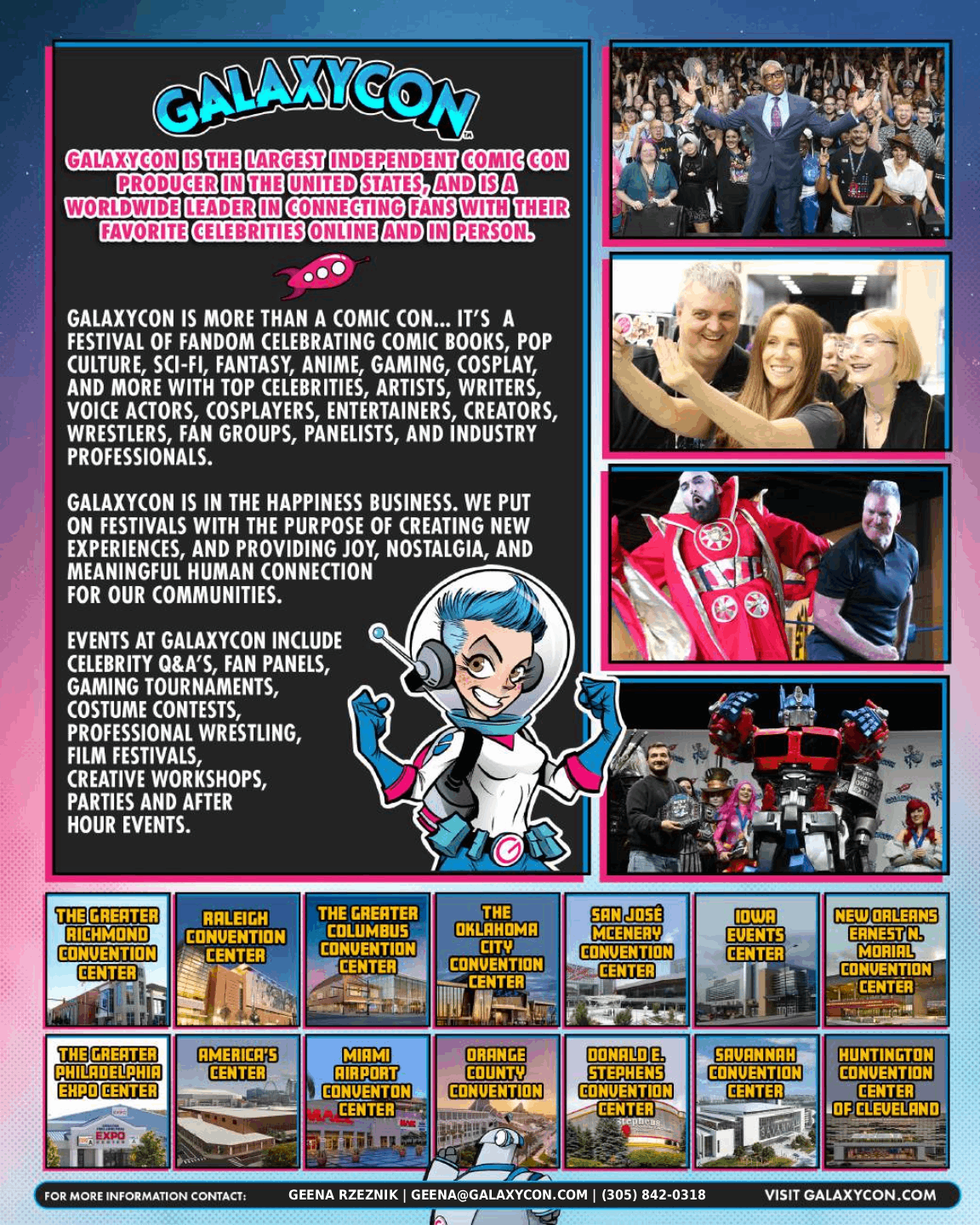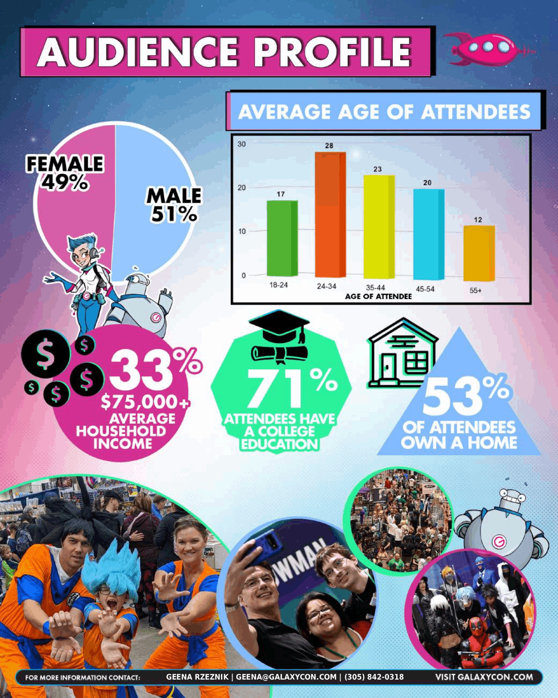 At GalaxyCon, I worked across marketing, creative strategy and event production, developing graphics, web assets + social campaigns for 3 brands across 12 national markets. My work supported live events nationwide, driving engagement, visibility, and ticket sales across digital platforms.