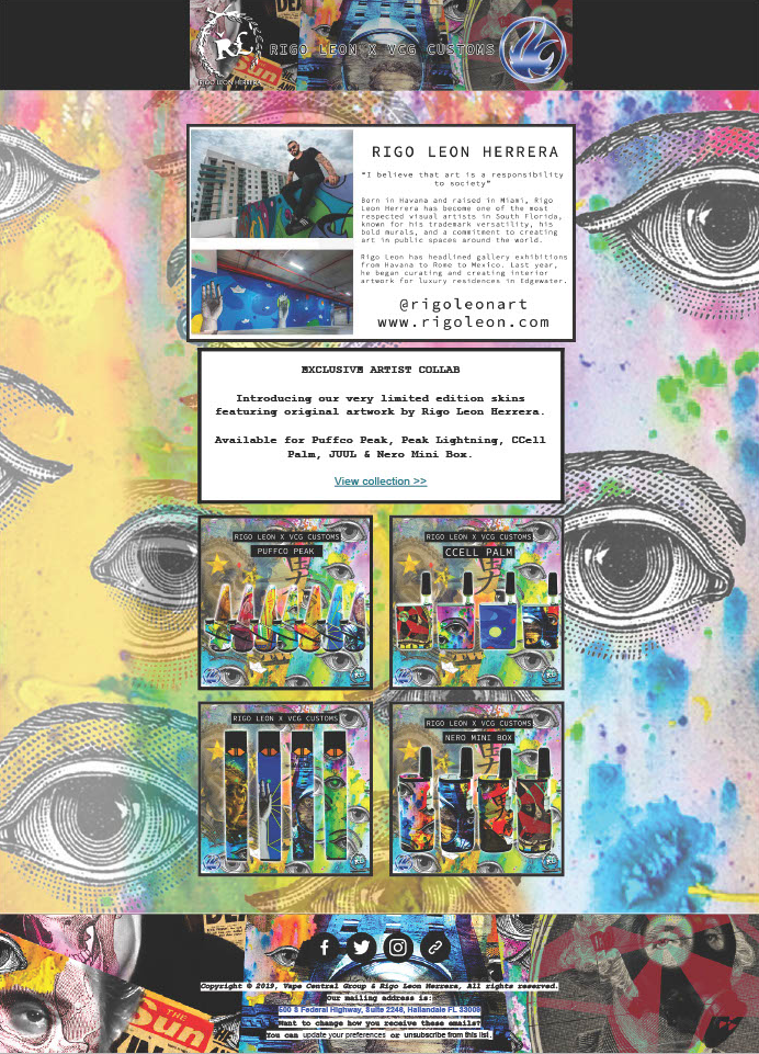At Vape Central Group, I managed ecommerce operations, digital content and marketing across multiple online marketplaces and platforms. My work included Shopify site design + management, product photography + mockups, graphic design, product listings, email campaigns, and produced visual assets including vinyl wrap templates + printed stickers for consumer electronics and vape products.